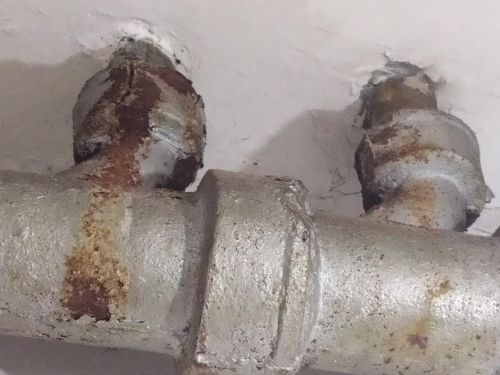 3、先把鑄鐵管拿鑄鐵焊條改成立式朝向下水,接著在后接管件頂端預(yù)置一個(gè)接頭,再把自家下水的PVC管接到接頭里面,把此接頭朝著自家下水的窟窿,之后在鑄鐵接頭內(nèi),PVC管周遭打上防水膩?zhàn)樱詈竽ㄉ戏浪z即可。